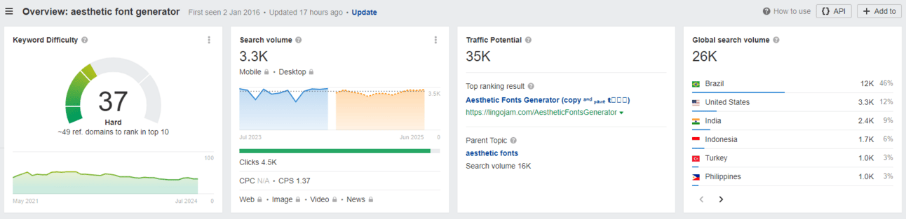 “aesthetic font generator” has a monthly US search volume of 3,300 and a traffic potential of 35,000 according to Ahrefs.