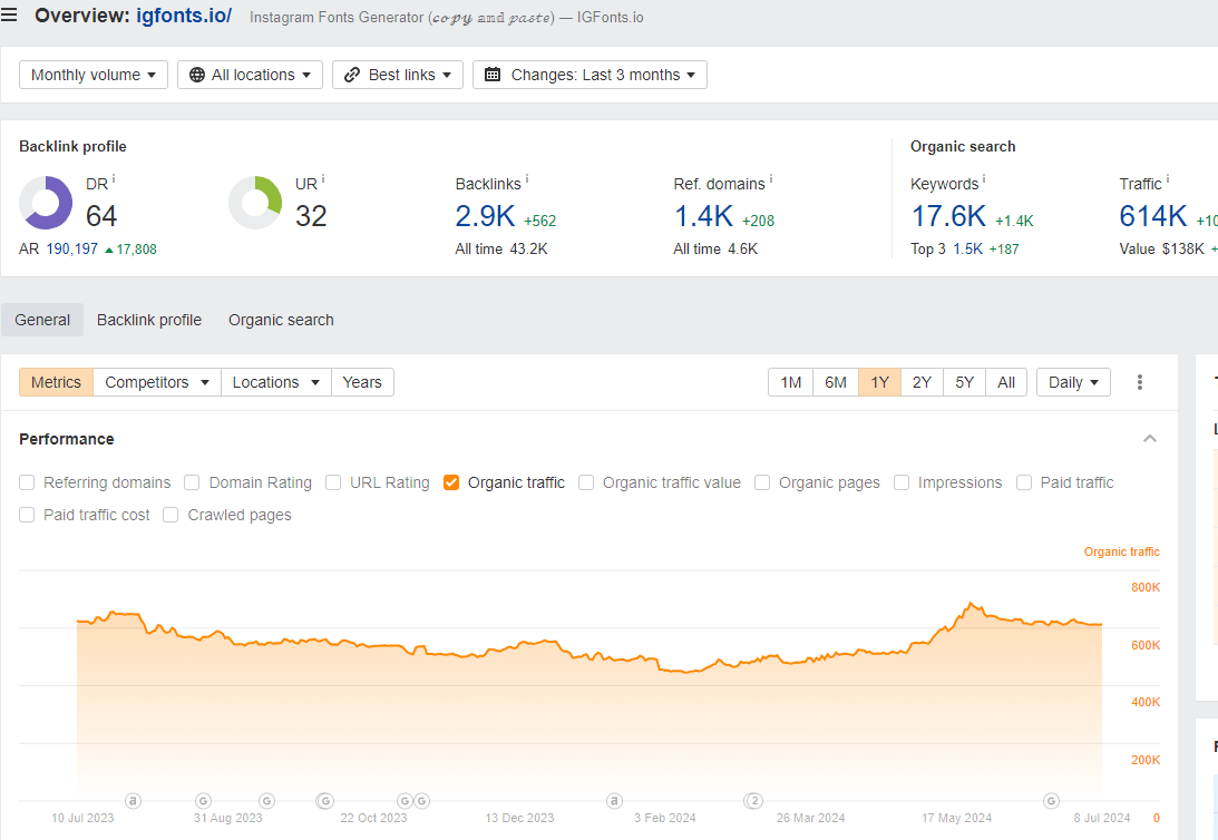 The “aesthetic fonts” niche is massive, which is another reason I built the site. For example, the super simple 1-page site igfonts.io gets 614,000 visitors per month according to Ahrefs, and 1.4 million according to SimilarWeb. It mainly ranks for “instagram font”-related keywords.