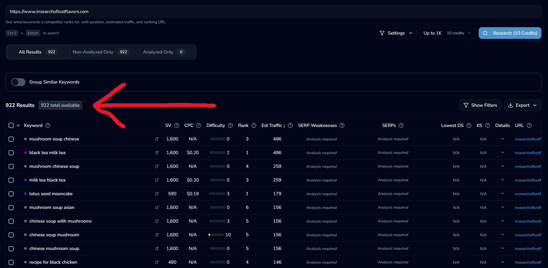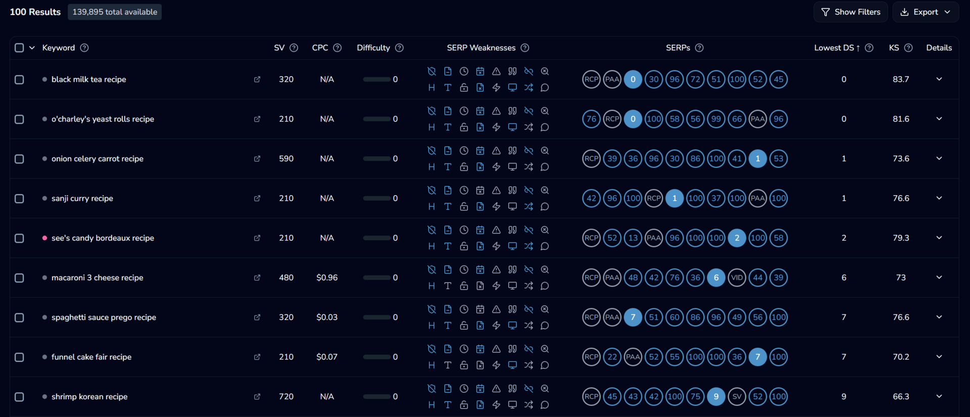 And just like that, I now have a list of keywords in the recipe niche that are easy to rank for - with the evidence to back it up.
