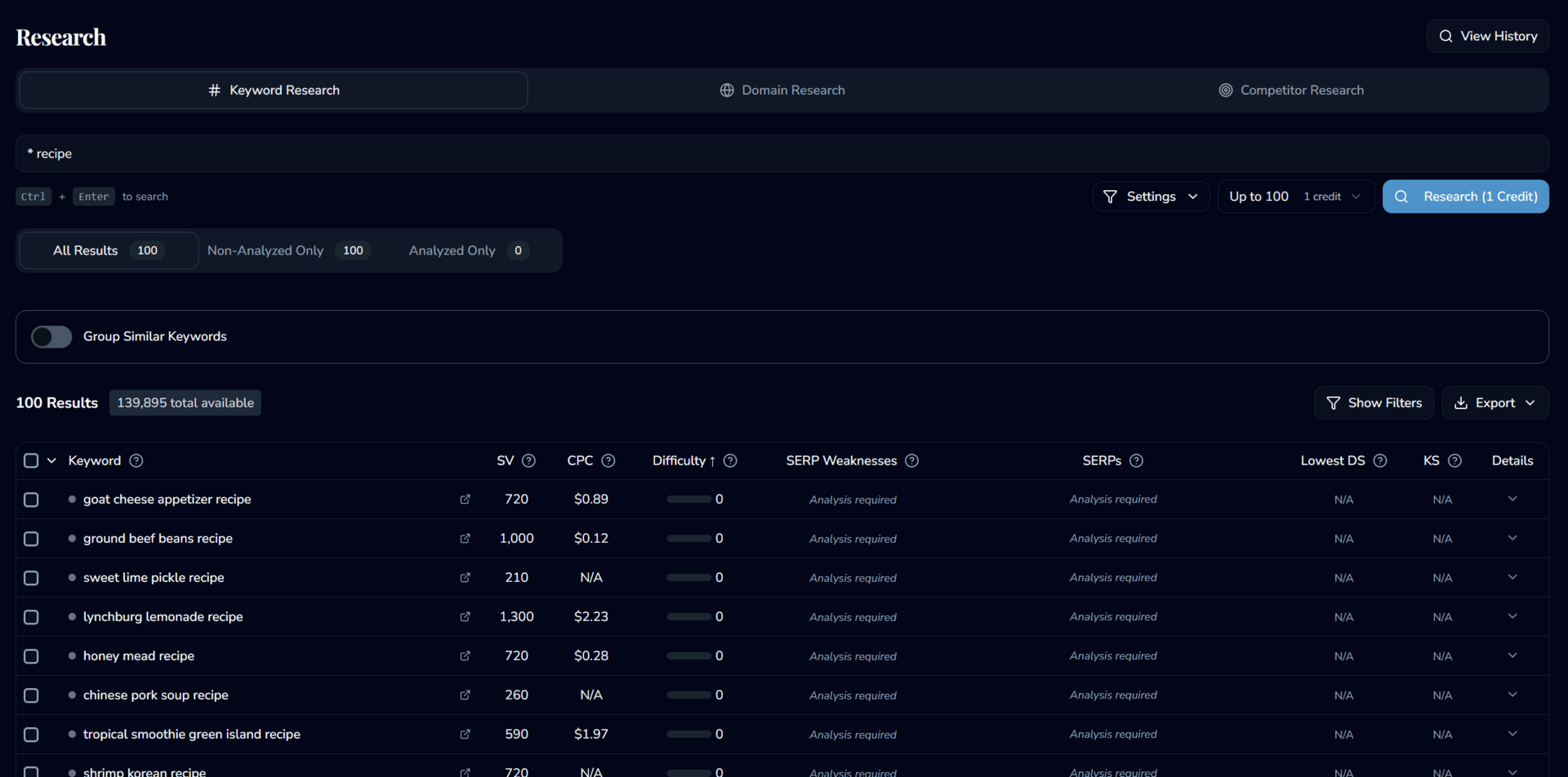 I’d go to the Keyword Research mode in ClearSERP, and search “* recipe” and sort by lowest difficulty (I also set max search volume to 2,000):