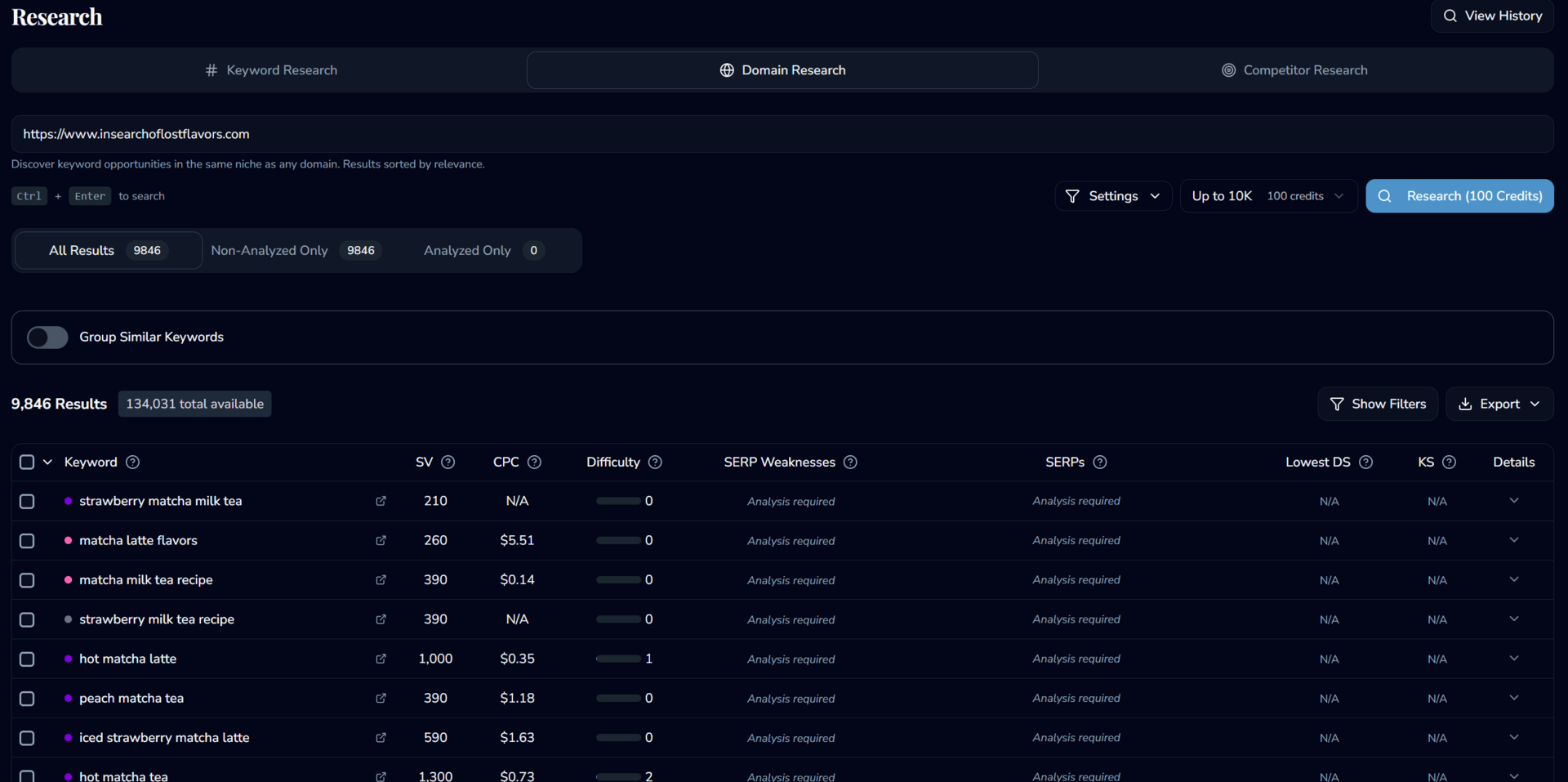 Domain Research mode is perfect for finding new keywords to target based on a URL. You can enter your own site or a competitor’s site and find tons of opportunities you otherwise would’ve missed!