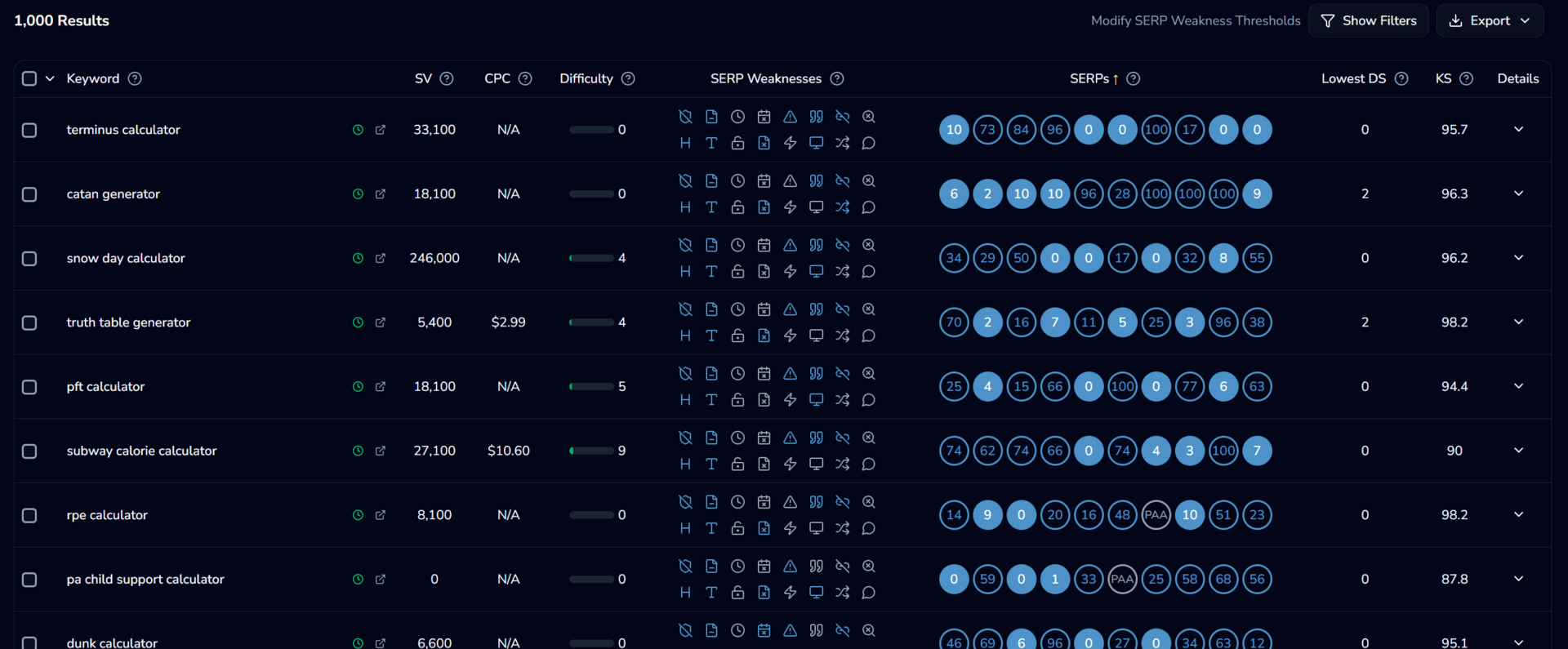 I have a giant list of online tool-related keywords (calculators, generators, etc.) It’s actually for sale at whattoship.com. But anyway, I took 1,000 of those keywords and analyzed them with ClearSERP.
