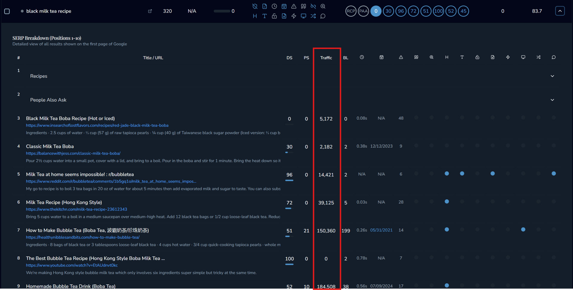 In the above screenshot, you’ll see the top ranking site for the keyword “black milk tea recipe” has a Domain Score (authority) of 0. Yet, that article is getting an estimated 5,172 monthly visits!