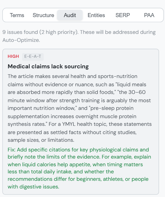 I think my favorite part of the optimizer is the “Audit”, which runs a Google Quality Rater audit on your article, using the actual Quality Rater Guidelines.