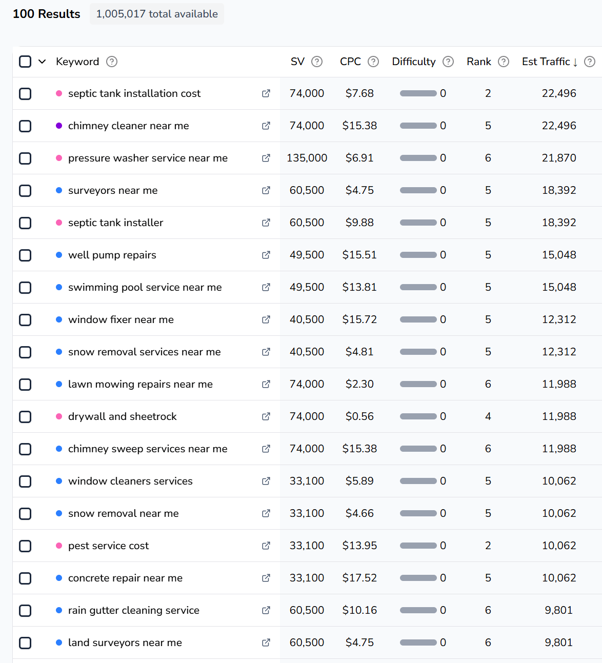 Or lets say you’re researching low competition niches for “rank and rent” sites. You could research angi.com with max difficulty set to 0: