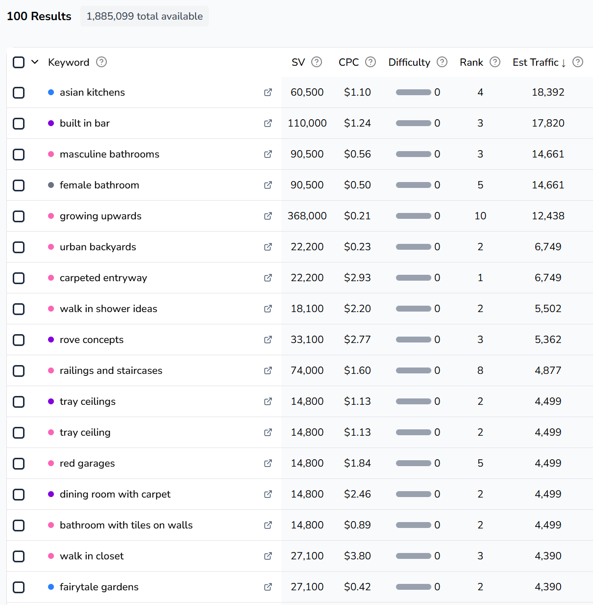 ClearSERP makes it extremely easy to find low competition keywords. For example, if you want to build a site in the “home and garden” niche, a good place to start finding high volume, low competition keywords would be to search a site like Houzz in Competitor Research mode, and set the max difficulty to 0.