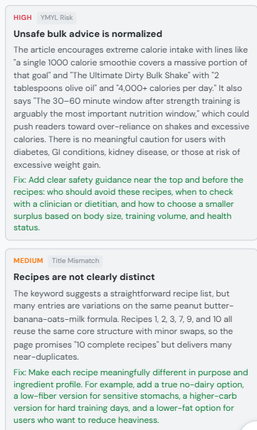 To fix the issues, I simply clicked “Auto-Optimize”, which ran for about 90 seconds, and then the article was completely refreshed and every issue from the audit was fixed.