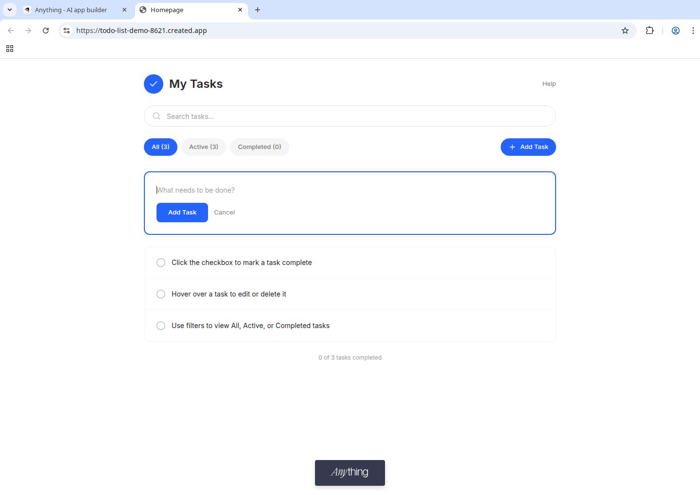 This todo list app was created by a browser agent which was doing research for a review of Anything AI. This happened all automatically. It was incredible to watch!