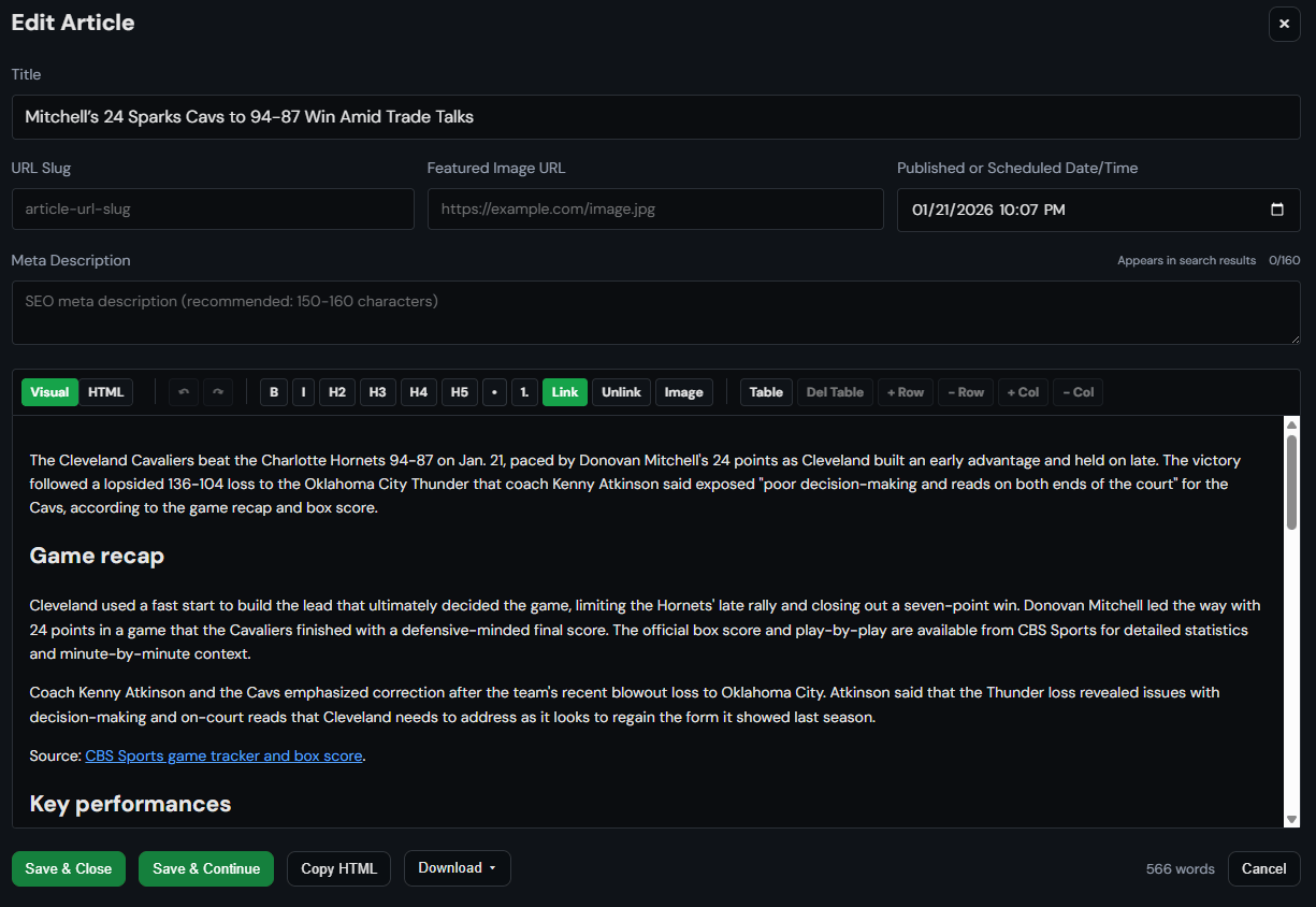 That last one was literally about the Cavs vs. Hornets game that happened last night. The agent was generating news automatically, based on actual research and info from multiple sources.