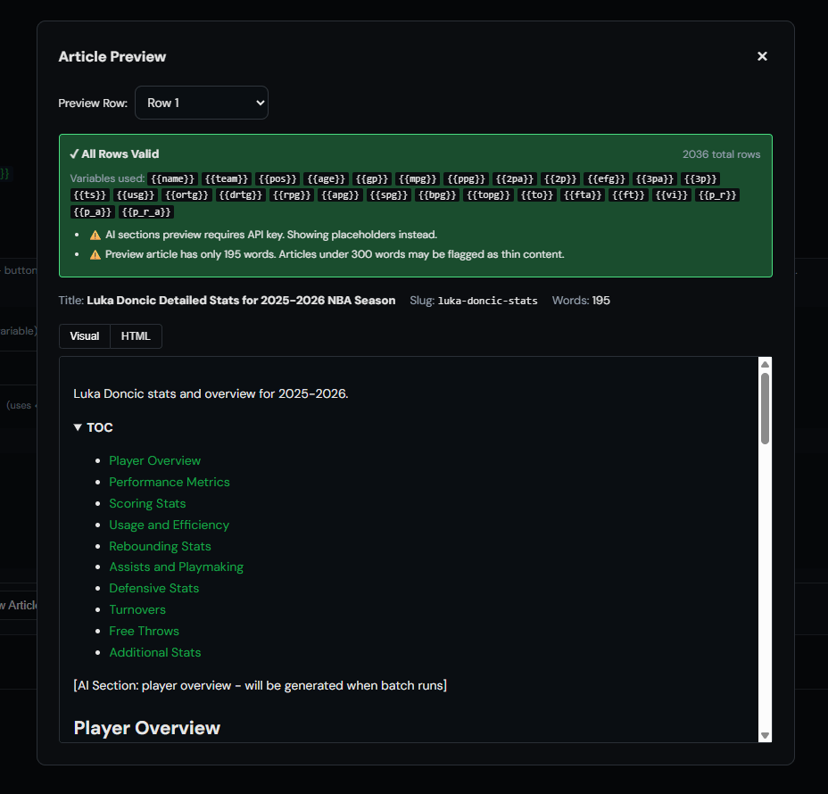 Once your template is set up, you can generate the articles and they’ll be ready in seconds (even if your spreadsheet has thousands of rows). Unless you have AI sections, in which case it’ll take more time as you’ll have to wait for the LLM to finish writing.