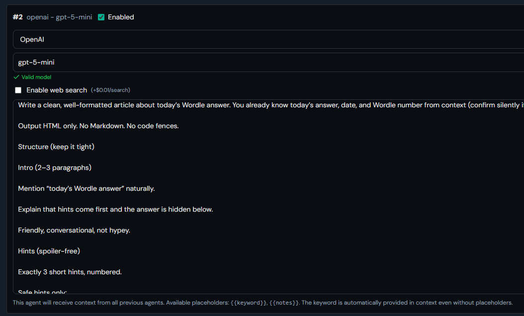 I could have also set up the agent to publish a NEW article with the wordle answer every day, but I opted for a daily refresh of the same article since that’s what the top ranking sites are doing.