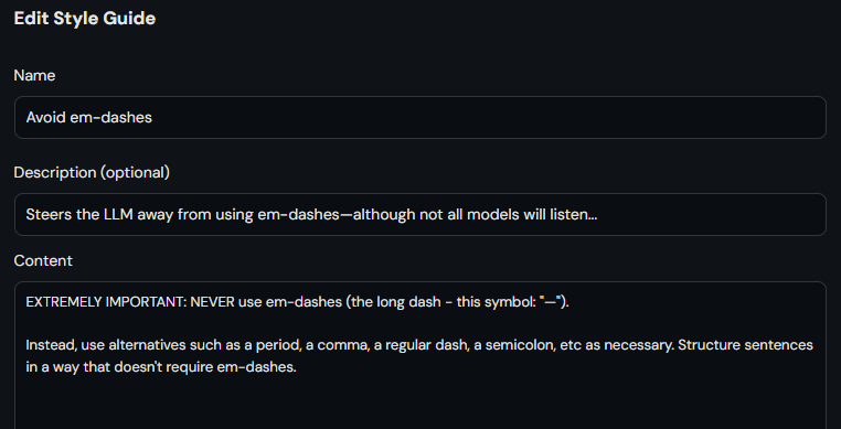 Here’s a style guide available in Publish Owl that works quite well (except for old AI models that are bad at following instructions):
