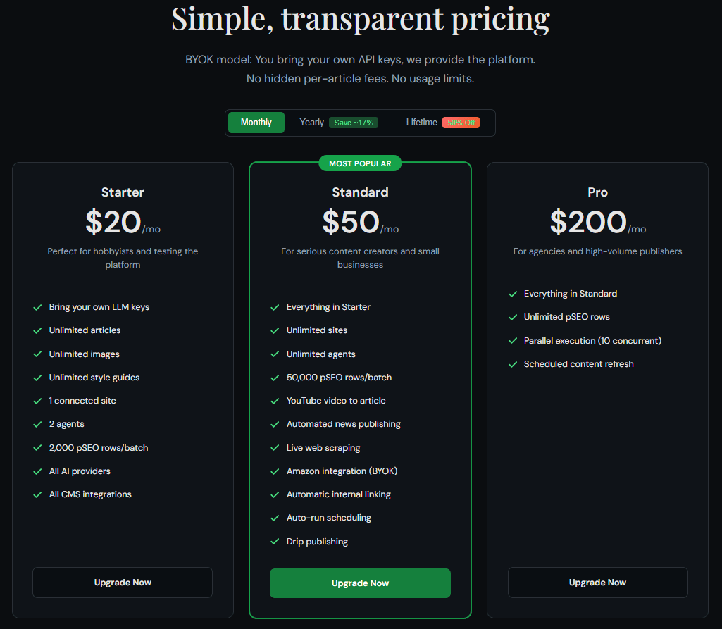 The $20/mo plan gives you unlimited article generations, but it doesn’t include most of the fancy features like web scraping, YouTube to article, automated news, Amazon integration, internal linking, etc. For those, the $50/mo plan is what you want.