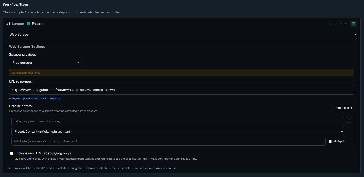 I also added a prompt for the article title (the LLM that handles this can see the output of the scraper and writer steps, so it knows what to do):