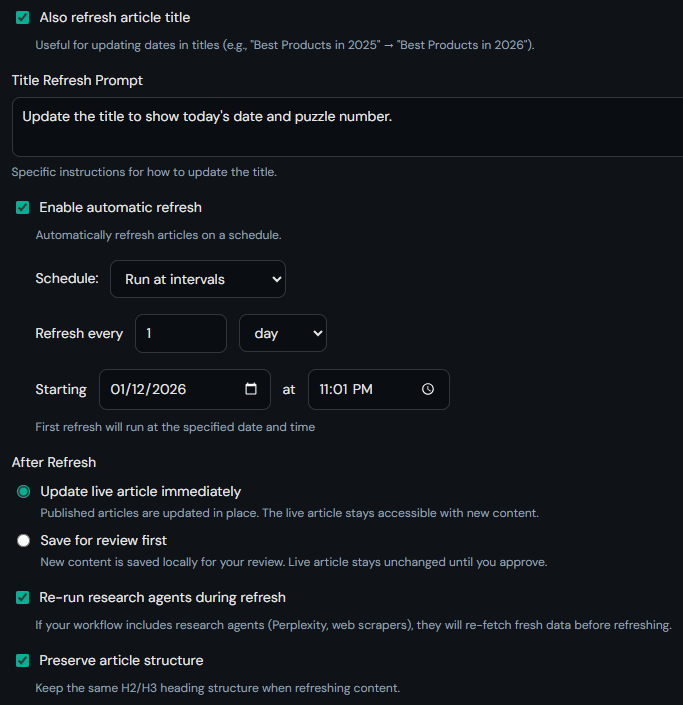 It’s a custom-built Astro site, so the only way to set up a daily wordle answer page would be with a custom automation through something like n8n. But n8n is confusing, so I built a feature to auto-update any article in Publish Owl.
