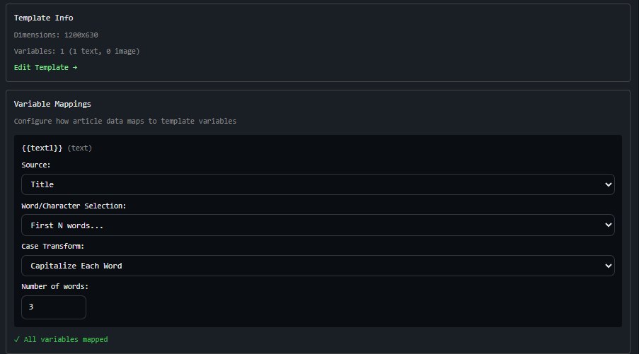 Let’s say you have a “synonyms” niche site. You want to publish an article for every English word, where you list that word’s synonyms. And let’s say you want a featured image that says “# Synonyms for [Word]” (like “27 Synonyms for Awesome”). You would set up an image template, which might have your site name and other elements in the image (these would be fixed for every article), and a text variable where you want the title text to go. You’d then map the text variable to Source: Title, and set the Word/Character selection to First N words, and set the number of words to 4.
